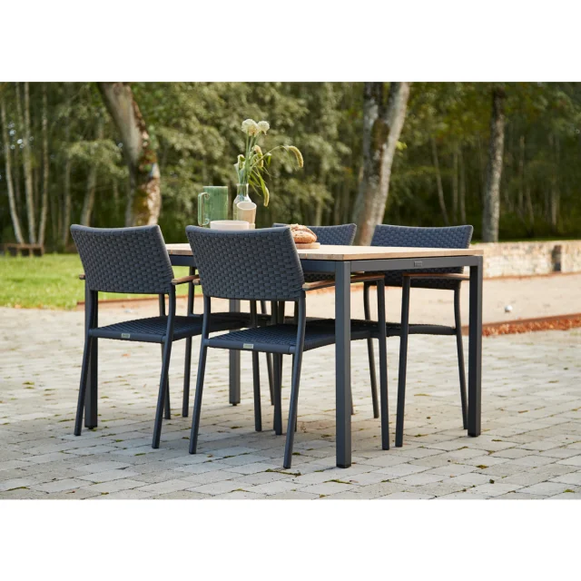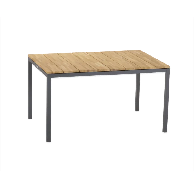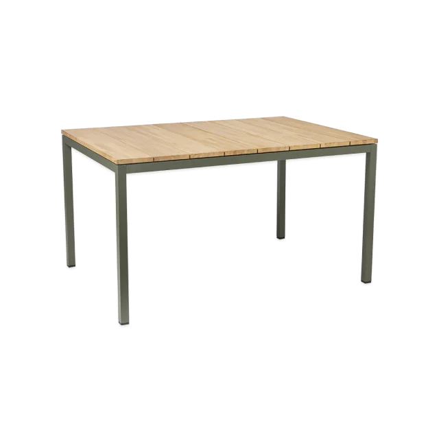 Bordet er fremstillet med bordplade i massivt teak og stel i pulverlakeret aluminium. Kombinationen af materialer sikrer både stabilitet, naturlig varme og høj holdbarhed i det skiftende danske vejr.