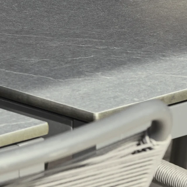 Bordet er fremstillet med stel i pulverlakeret aluminium og bordplade i kompaktlaminat med skifer-look. Materialerne gør bordet særdeles slidstærkt, ridsefast og modstandsdygtigt over for både vand, frost og temperatursvingninger.