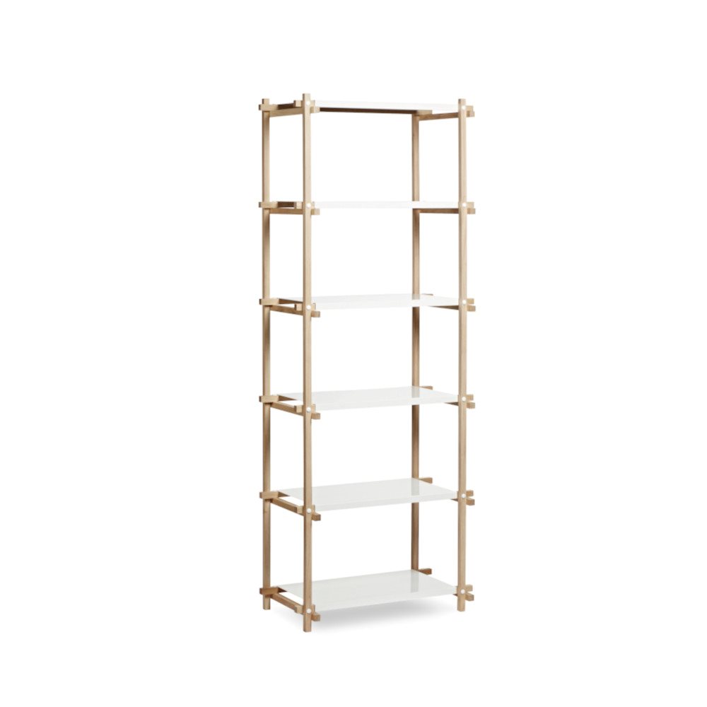 Woody-serien er lavet af FSC-certificeret ubehandlet egetræ med hvide pulverlakerede stålhylder og fås i flere forskellige størrelser, som kan blandes og bruges som et fritstående hyldesystem, mod en væg eller som en rumdelere.