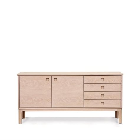 Konstruktionen er enkel, men består af mange håndværksdetaljer. Fronten er asymmetrisk med skuffer i den ene side. De integrerede dør- og skuffehåndtag samt de afrundede hjørner på toppen og rammen giver skænken et harmonisk og rent udtryk.