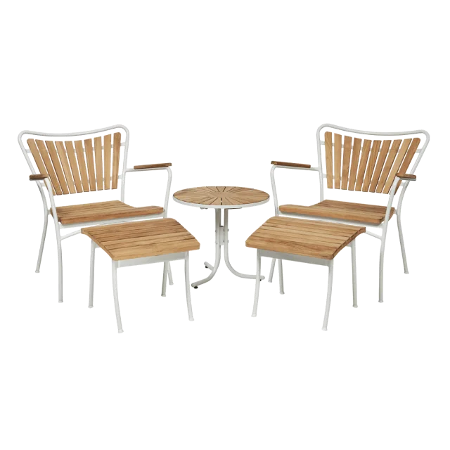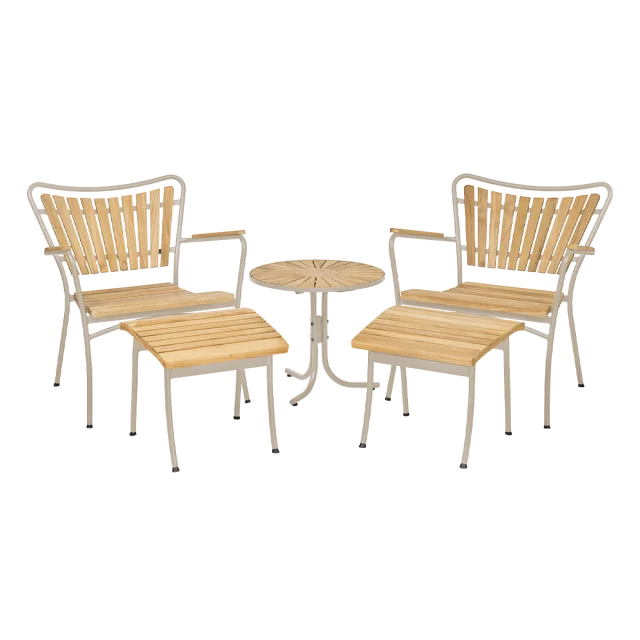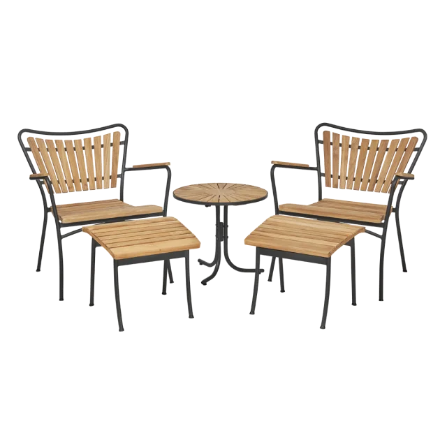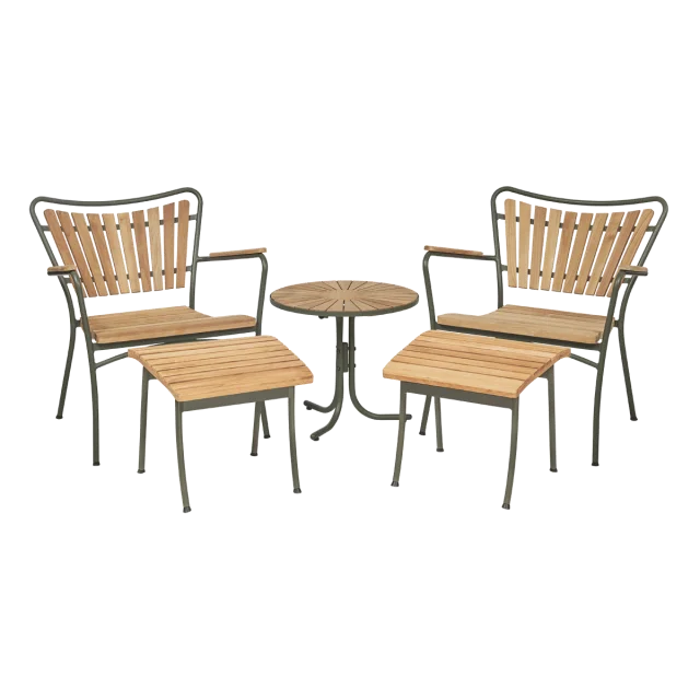 Loungesættet består af komfortable loungestole, tilhørende fodskamler og et lille rundt loungebord, der tilsammen skaber et harmonisk og indbydende loungeområde. Den tilbagelænede siddeposition giver ekstra komfort, så du kan læne dig tilbage og nyde lange sommerdage eller afslappende aftener udendørs.