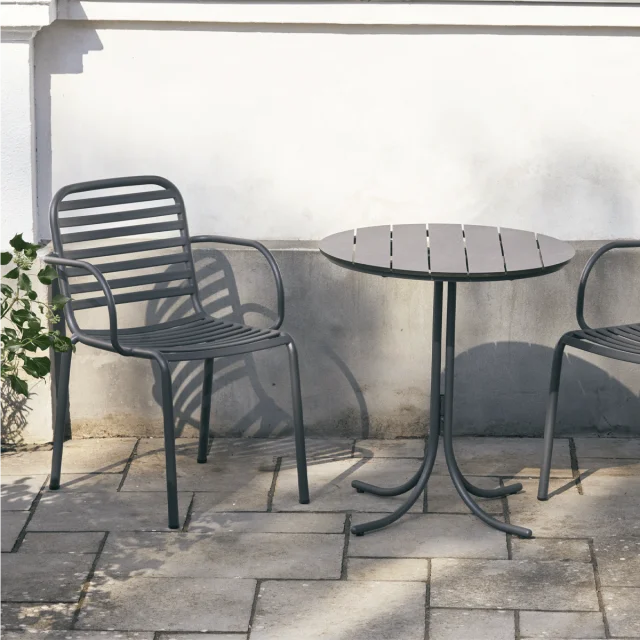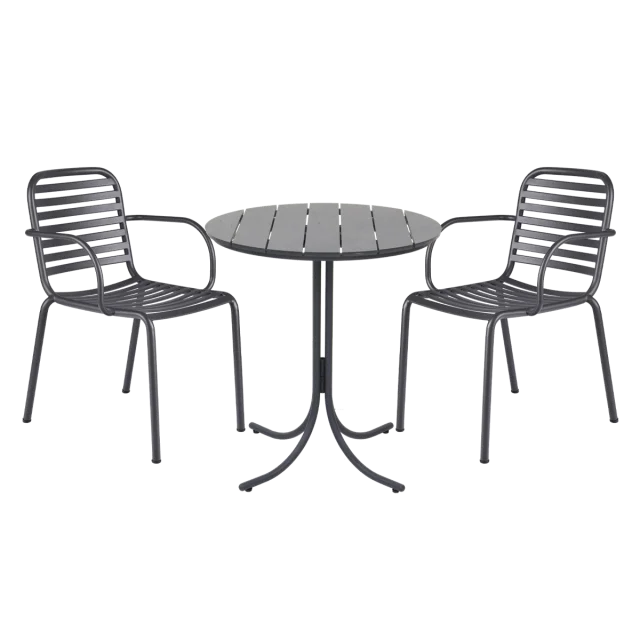 Den antracitfarvede finish giver cafésættet et elegant og tidløst udtryk, der passer naturligt ind i både moderne og klassiske udemiljøer.