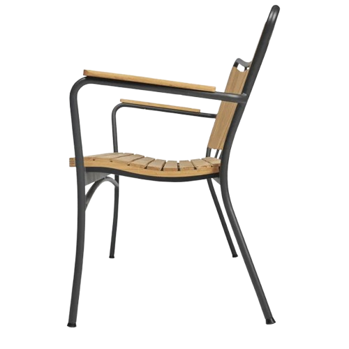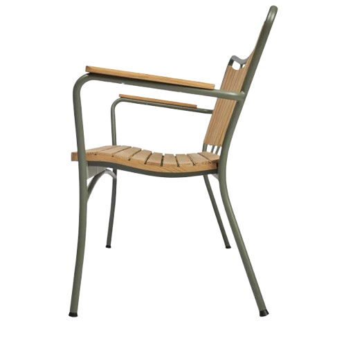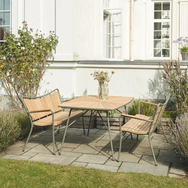 Sæde og armlæn er fremstillet i teaktræ, mens stellet er udført i pulverlakeret aluminium. Kombinationen giver både et let udtryk og en robust konstruktion, der er velegnet til det skandinaviske klima. Teaktræet er en naturligt olieholdig træsort, som udvikler en smuk patina over tid og kræver minimal vedligeholdelse.