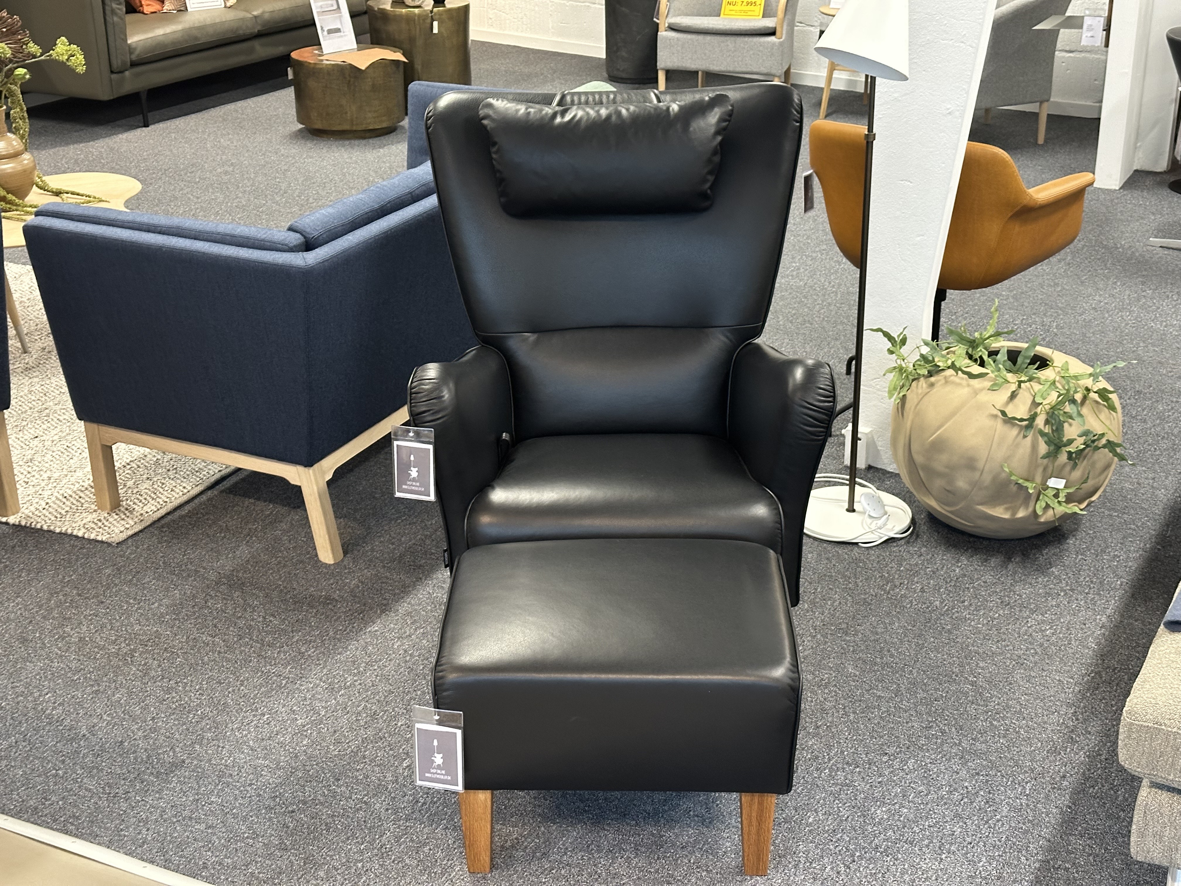 Som udstillingsmodel kan der forekomme lette brugsspor fra fremvisning, men lænestolen fremstår samlet, funktionel og klar til levering.