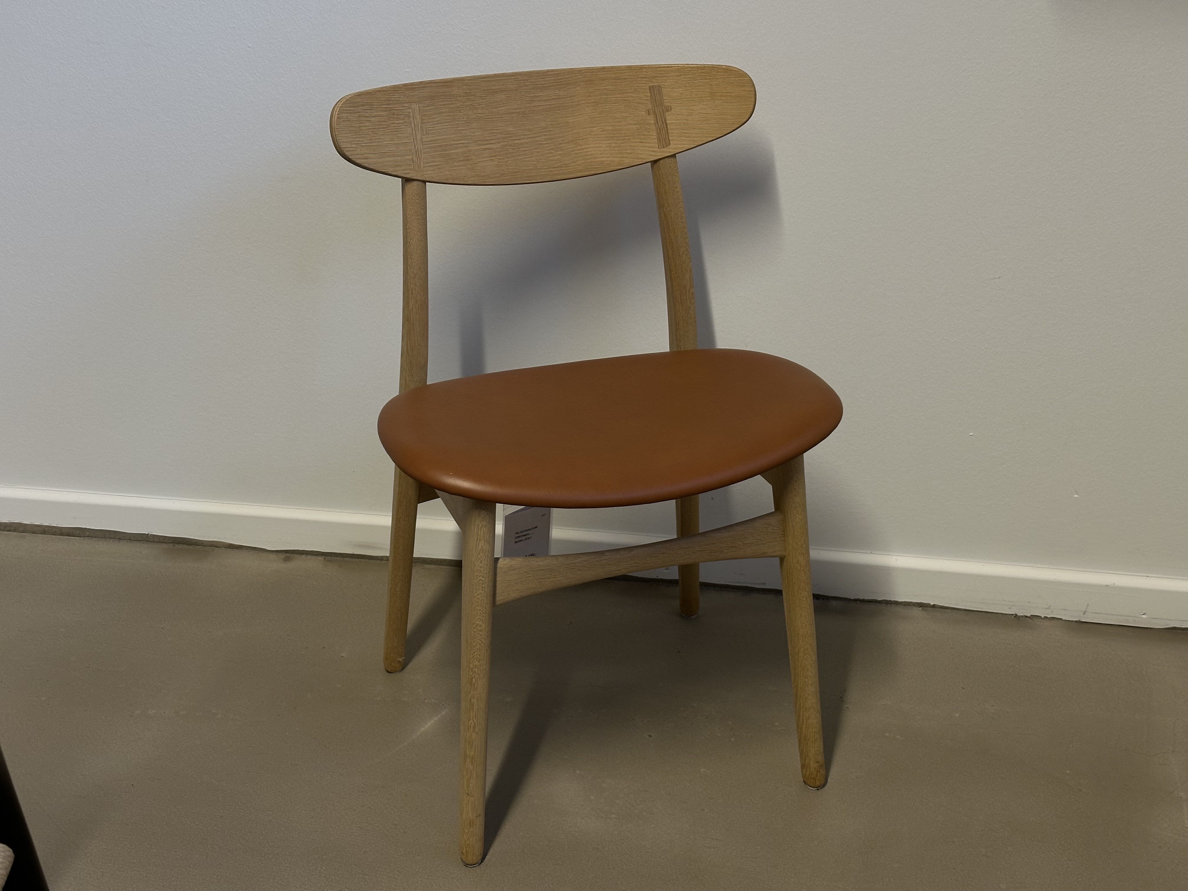 UDSTILLINGSMODEL Carl Hansen & Søn CH30P spisebordsstol er en elegant og komfortabel stol med klassisk dansk design og solidt håndværk. Stolen er udført i eg med sæbebehandling, som fremhæver træets naturlige struktur og tone, og den er betrukket med sif cognac læder, der tilføjer varme og karakter til den tidløse silhuet.