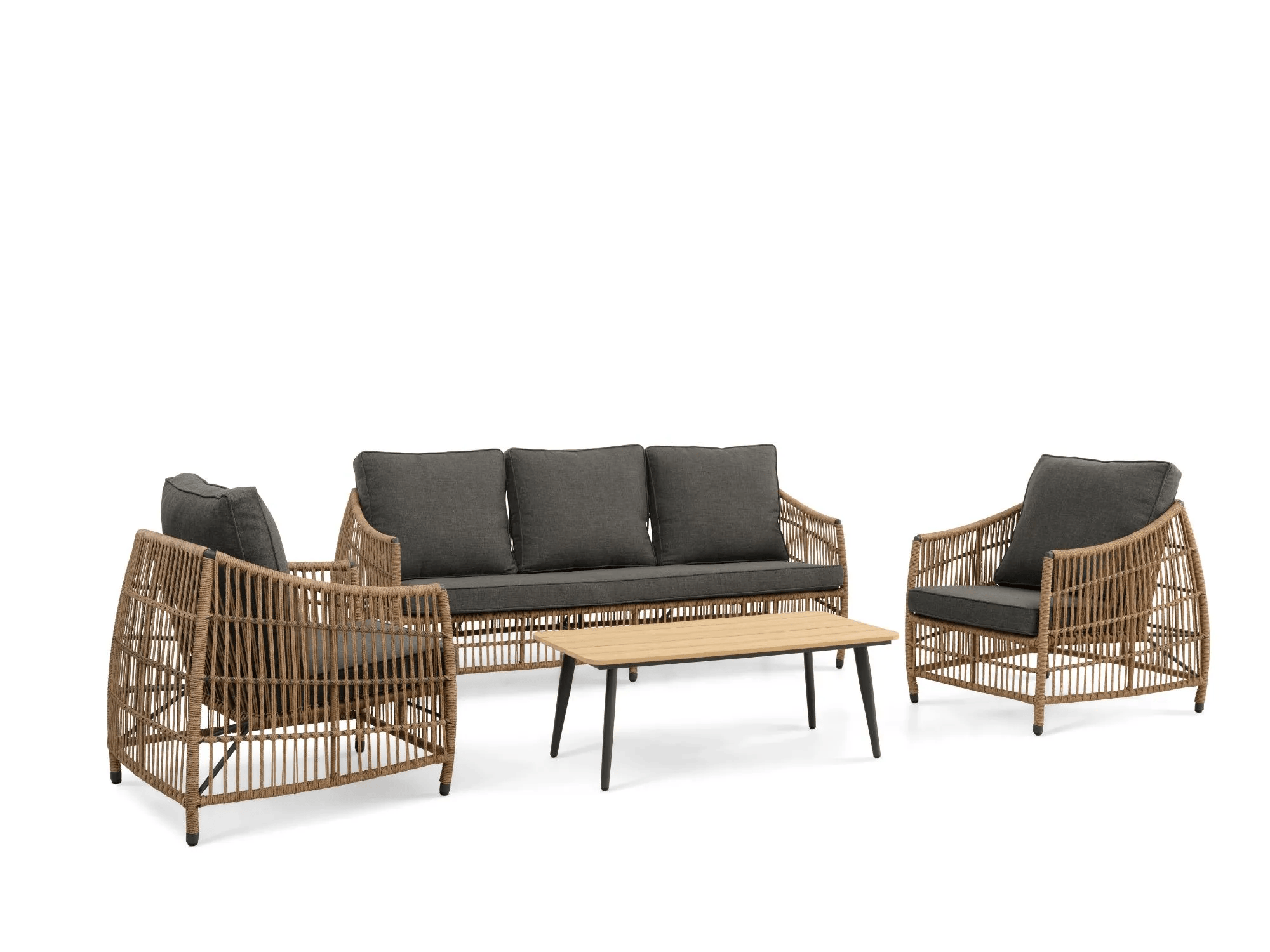 Loungesættet består af en rummelig sofa, to loungestole samt et praktisk sofabord. Kombinationen giver gode siddepladser og skaber en naturlig ramme for både afslapning og hyggelige stunder med familie og venner. Designet er let og moderne, hvilket gør sættet nemt at integrere i mange forskellige uderum.