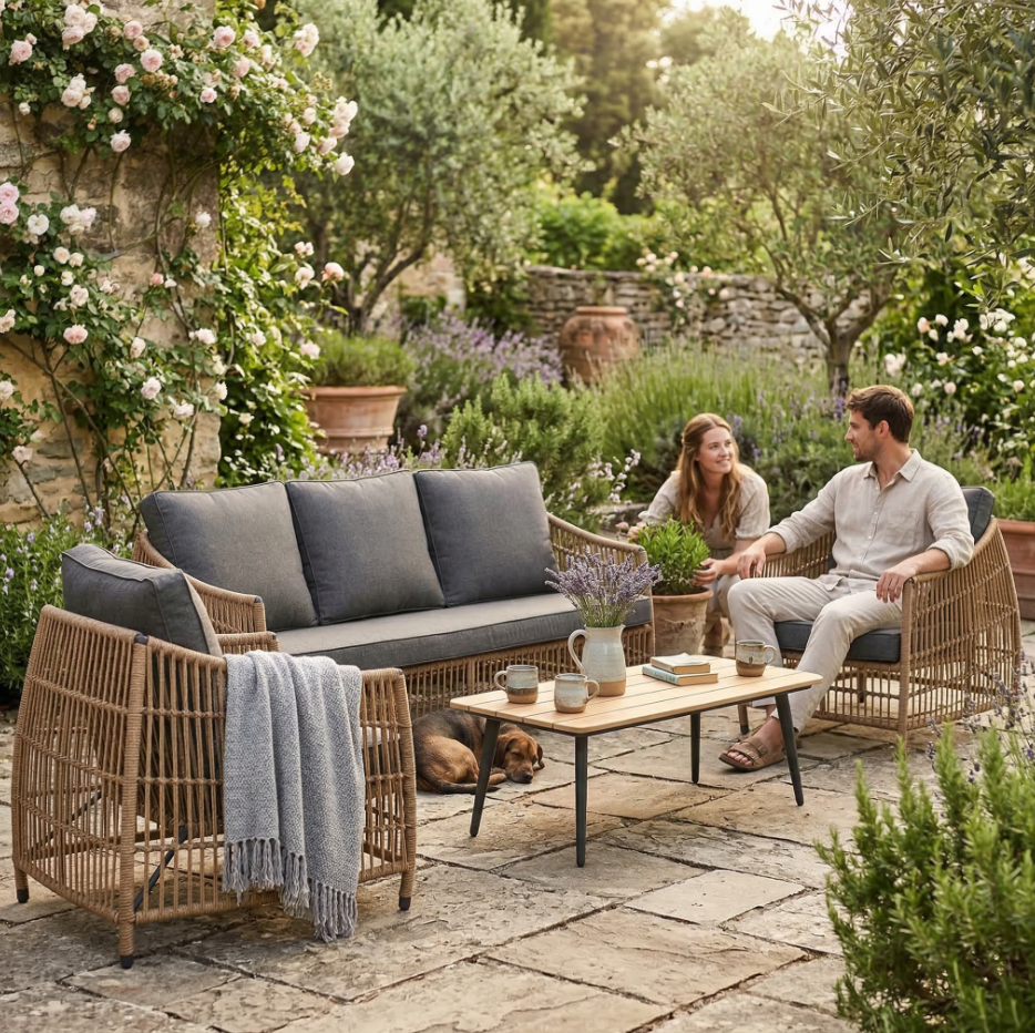 Et komfortabelt og stilrent loungesæt, der skaber en hyggelig og funktionel loungeplads i haven eller på terrassen.