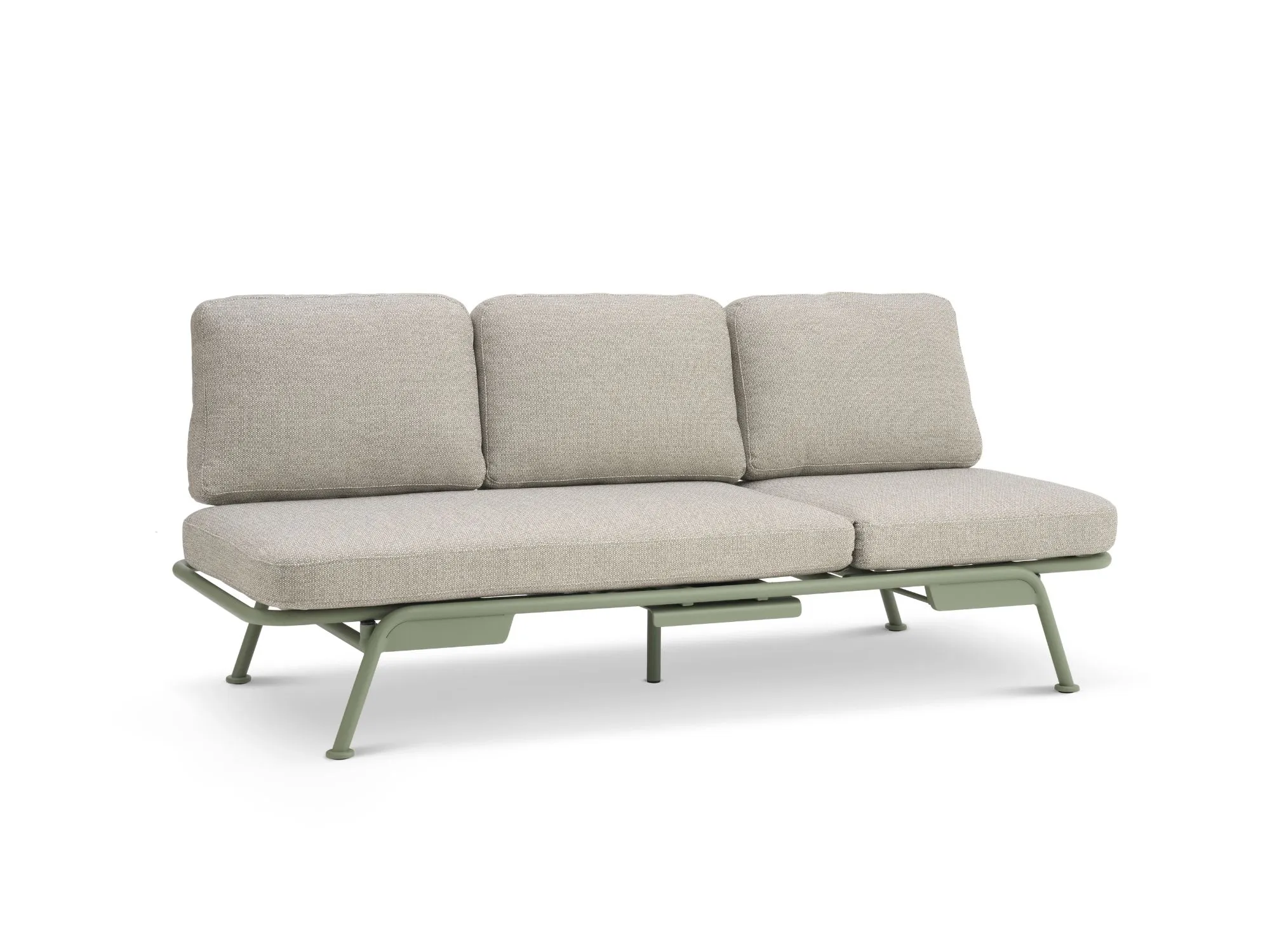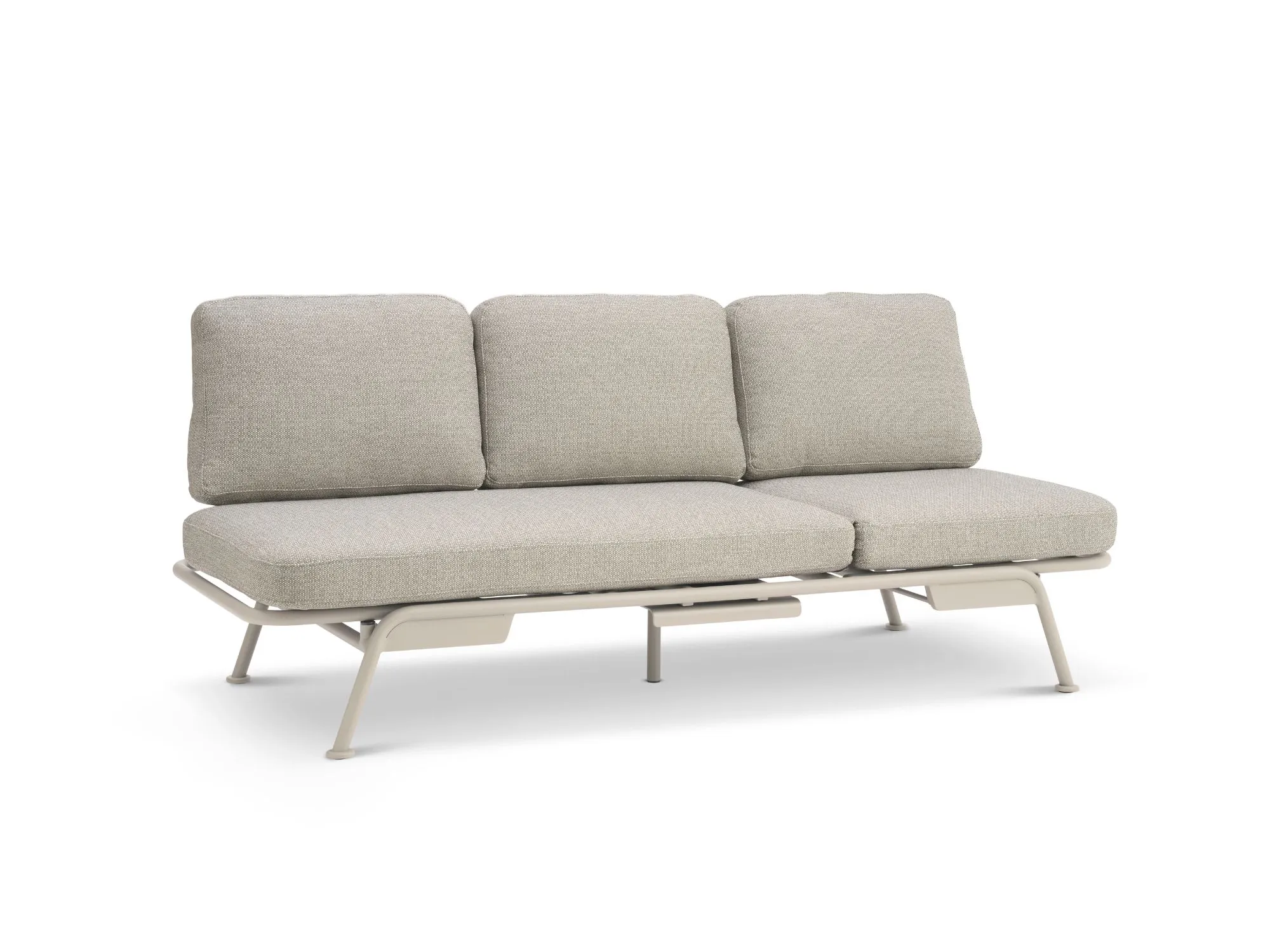 Sofaen er fremstillet i pulverlakeret aluminium, som giver et let og moderne udtryk samtidig med, at materialet er robust og vejrbestandigt. Hynderne er lavet i slidstærkt Olefin-stof, der er vandafvisende og modstandsdygtigt overfor solens UV-stråler, hvilket gør sofaen velegnet til udendørs brug.